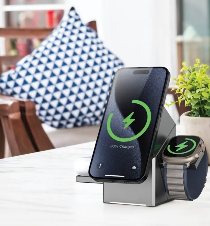 این شارژر دارای پدهای شارژ اختصاصی برای گوشی هوشمند، ساعت هوشمند و هدفونهای بیسیم است و عملکرد شارژ سریع و قابلاعتمادی را برای تمامی دستگاهها فراهم میکند. فناوری شارژ هوشمند آن بهطور خودکار قدرت خروجی بهینه برای هر دستگاه را تشخیص میدهد و اطمینان حاصل میکند که هر بار شارژ ایمن و کارآمد انجام شود.
